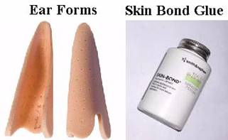 NOTE: Il est préférable d'avoir des Formes qui sont faite spécialement pour cela, mais si vous avez de la difficulté et en avoir vous pouvez essayer une autre solution plus disponible, vous pouvez acheter en pharmacie du Dr. Scholl's (moleskin) en forme triangulaire (pas trop largement évasée dans le bas) qui servira de forme, un peu plus petit que l'oreille, mais assez longue  pour allez jusqu'a au moins un pouce de la pointe.  Décoller l'adhésif, ajouter une fine couche de colle sur le revêtement préencollé, laisser sécher jusqu'à ce que ce soit collant et pressez le en position dans l'oreille.  Maintenez et appuyez fermement sur la surface de l'oreille dans une position concave (comme une coquille) jusqu'à ce que vous pensez que chaque partie a été bien collé contre la peau bien propre. Assurez-vous que la forme est continue et suit la forme de l'oreille sans boursouflure c'est très important.